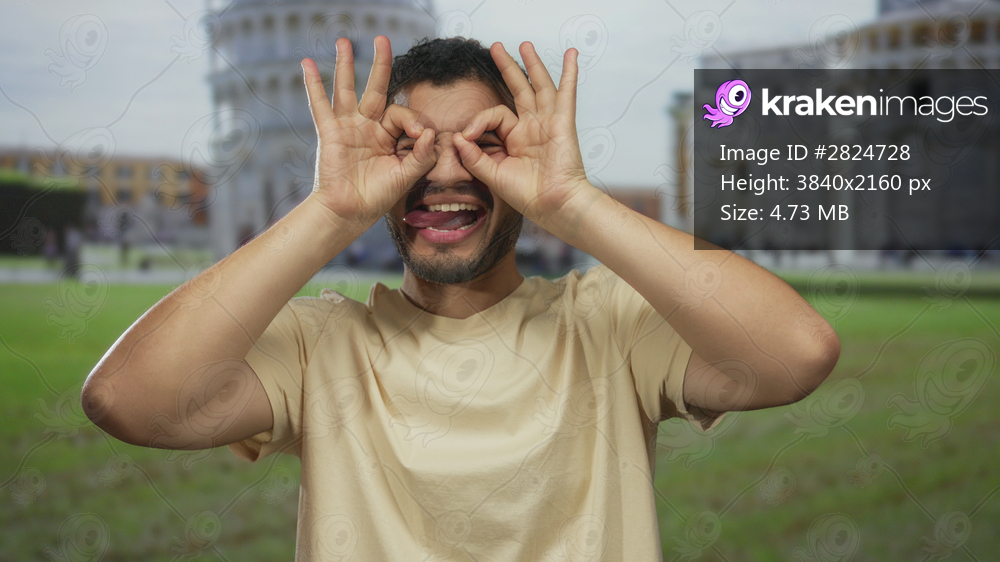 Man with bare arms making hand binoculars to eyes at building beside tower facade on green lawn; exploration fun.