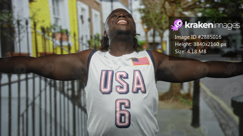 Man with bare arms outstretched on street wearing usa basketball jersey with flag patch, smiling broadly and looking upward; joy freedom.