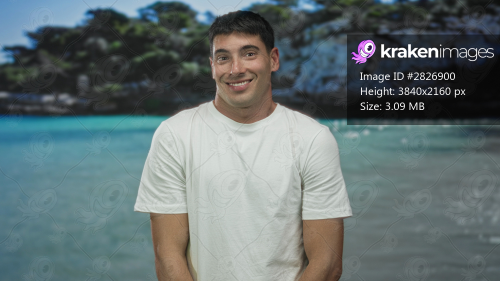 Man with bare arms tilts head under sunlit sky by turquoise seaside forest at beach; uncertainty doubt hesitation.