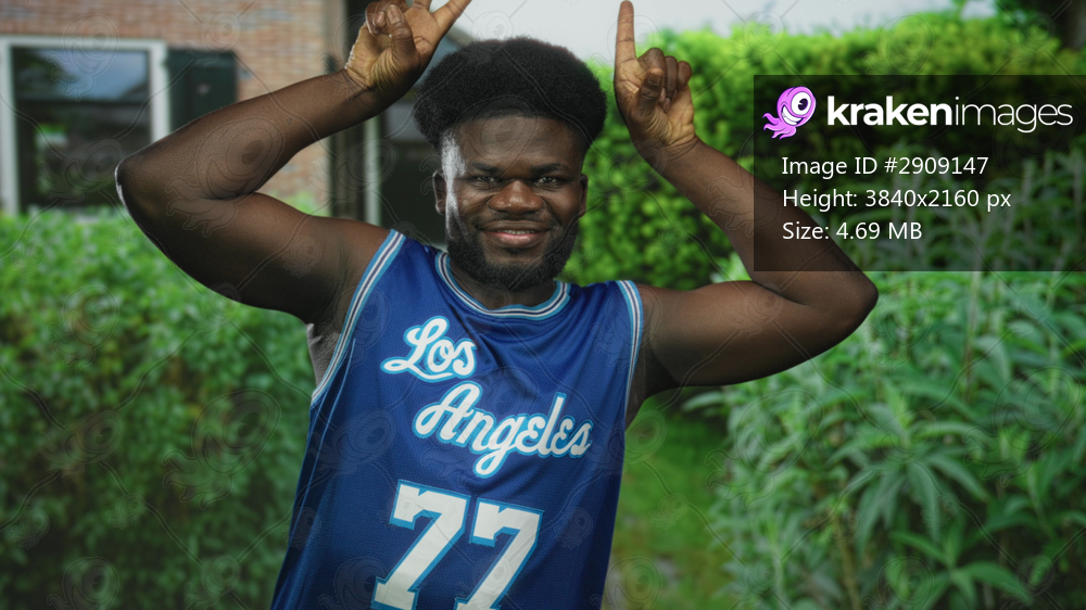Man with bare arms wearing blue basketball jersey points index fingers upward at building entrance while smiling and standing outdoors; playful leisure. - Kraken Images