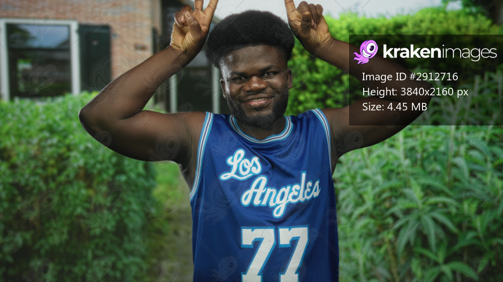 Man with bare arms wearing blue basketball jersey points index fingers upward at building entrance while smiling and standing outdoors; playful leisure. - Kraken Images