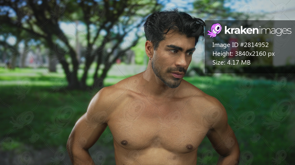 Man with bare chest gently touches his shoulder with hand in a green park under morning sunlight; serenity.