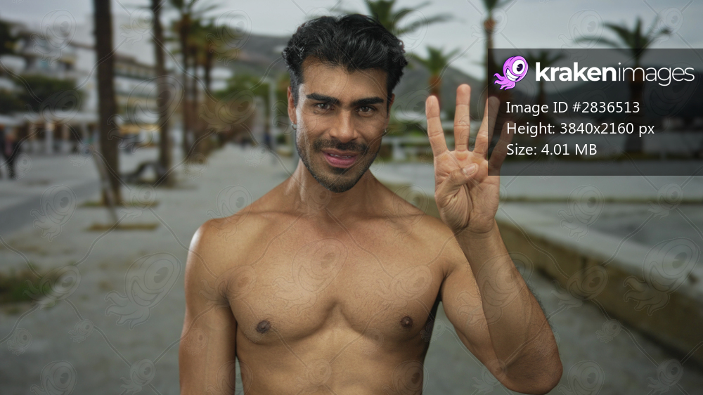 Man with bare chest holds up four fingers on sunlit street under palm trees; confidence and optimism.