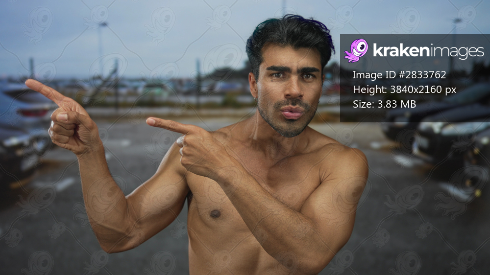 Man with bare chest points both fingers toward blurred cars while glancing sideways in street parking lot; self doubt.