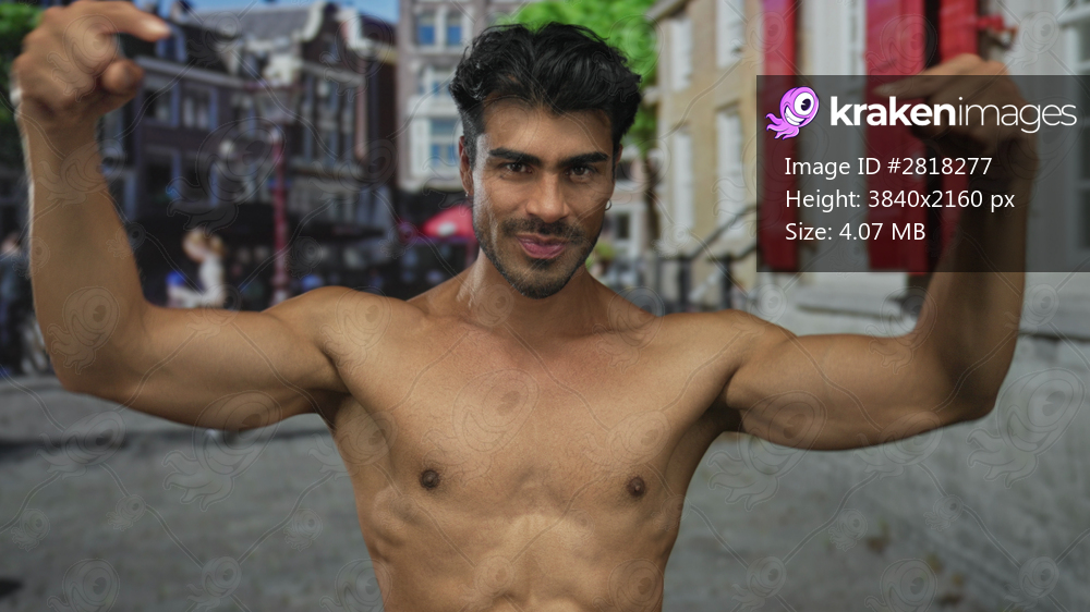 Man bare chest smiling on street with red shutters and brick wall under bright sunlight; confidence vitality health energy.
