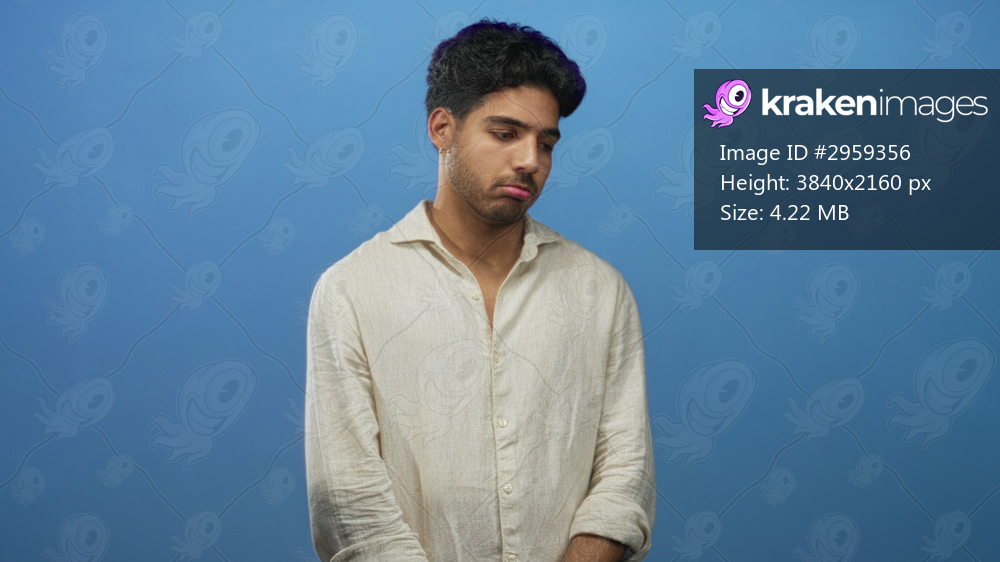 Man with bare face pouting lower lip and slouched posture wearing beige linen shirt against blue studio backdrop, hands relaxed at waist; melancholy.