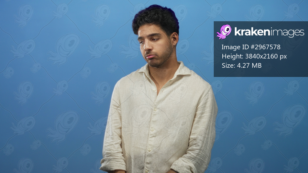 Man with bare face pouting lower lip and slouched posture wearing beige linen shirt against blue studio backdrop, hands relaxed at waist; melancholy.