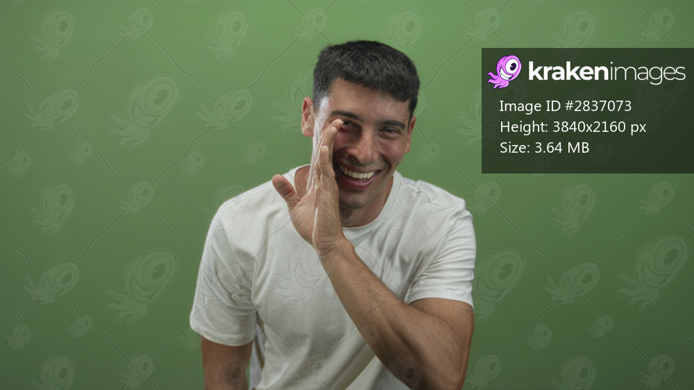 Man with bare hand cupped to mouth whispering a secret in a bright studio setting with green wall; secret joy.