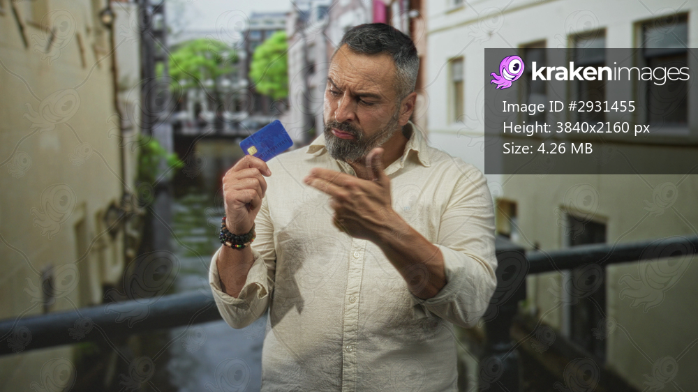 Man with bare hand holding creditcard on building balcony over canal while grimacing; skepticism concern.