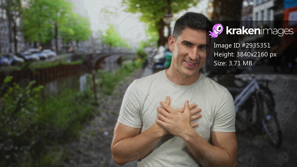 Man with bare hands crossed over chest, smiling with palms pressed to sternum on a canal street beside a parked bicycle and riverside walkway; gratitude warmth connection. - Kraken Images