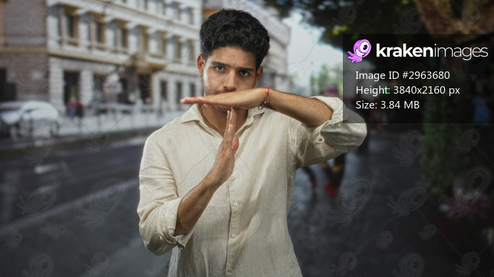 Man with bare hands making a time out gesture on a busy street by building facades, wearing beige linen shirt and looking directly at camera; confidence. - Kraken Images