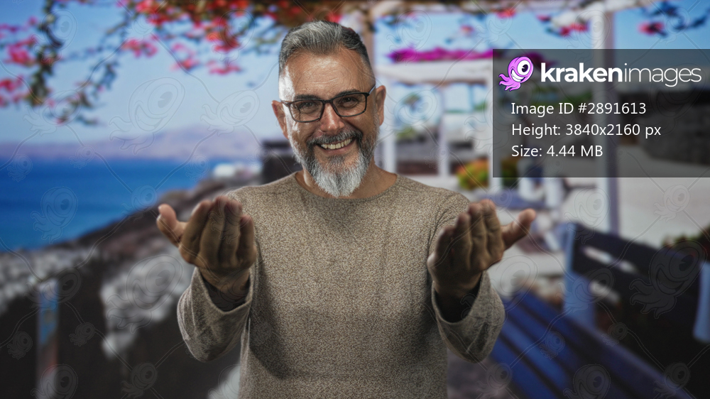 Man with bare hands palms up beckoning on a street by the seaside promenade, smiling and facing camera; welcome warmth.