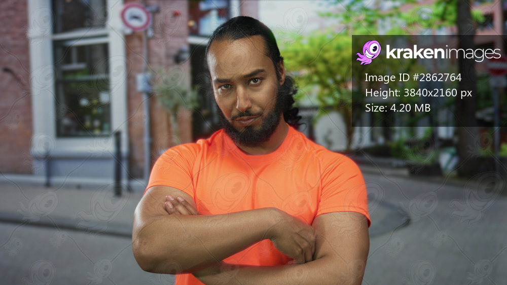 Man with beard and arms crossed on city street by brick building wearing bright orange shirt and looking at camera; quiet confidence.