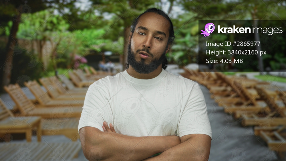 Man with beard and arms crossed wearing white tshirt by poolside lounge chairs among tropical trees forest, direct gaze and relaxed posture; confidence. - Kraken Images