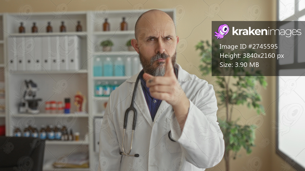 Man with beard and bald head in a clinic wearing a lab coat and stethoscope gestures seriously in a medical room with shelves filled with supplies and a plant nearby. - Kraken Images