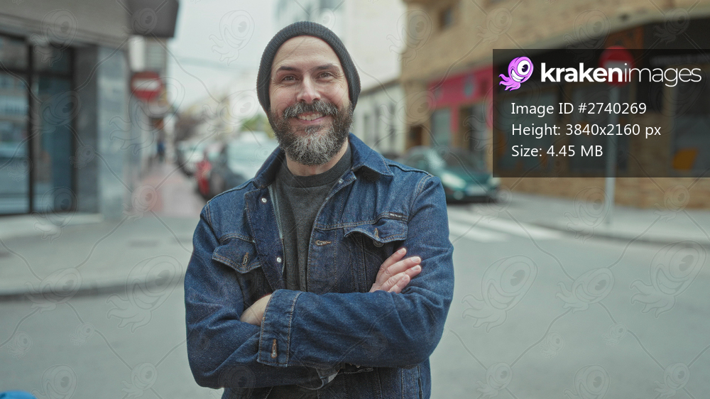 Man with beard and bald head smiling at the camera outdoors on an urban street, wearing a denim jacket and beanie, with arms crossed and cars in the background. - Kraken Images