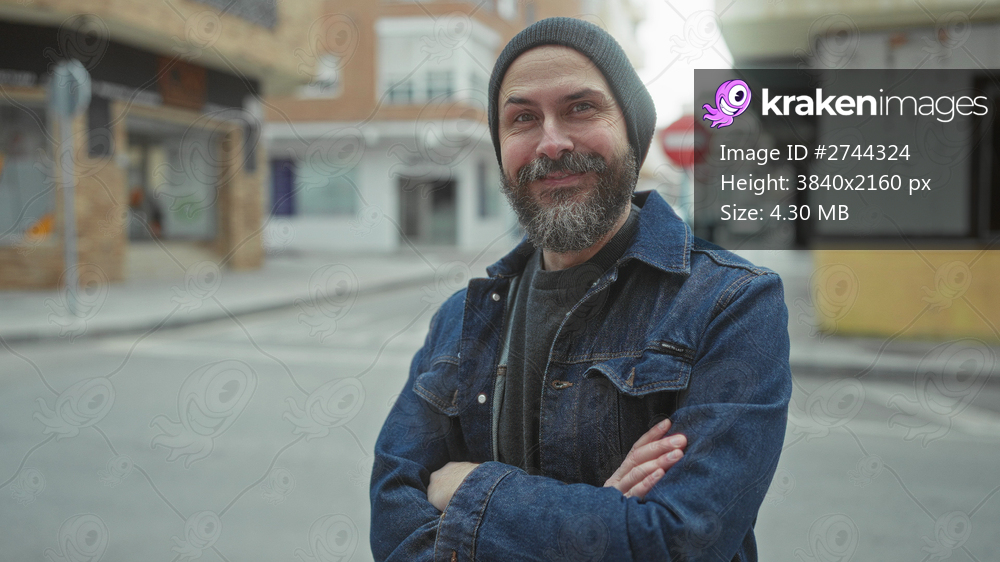 Man with beard and beanie stands confidently on urban street with arms crossed, denim jacket, and relaxed expression in city setting.