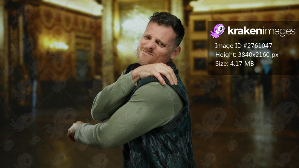 Man with beard and blue vest standing indoors in a historic museum setting, showing an uncertain expression while touching shoulder, capturing a moment of introspection and reflection. - Kraken Images