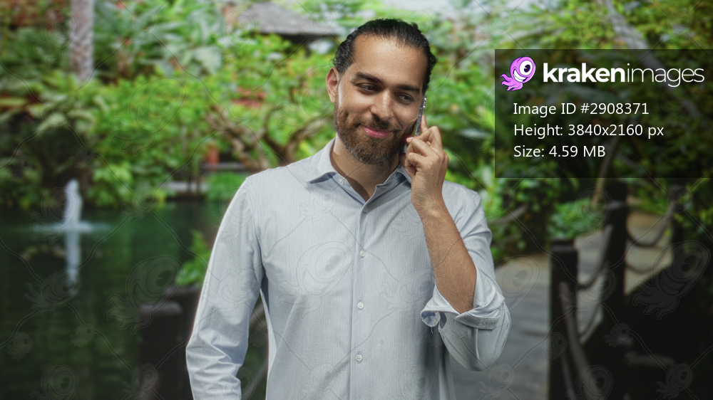 Man with beard and bun holds phone to ear in forest walkway by a pond and wooden bridge, smiling in a light blue shirt; serenity connection.