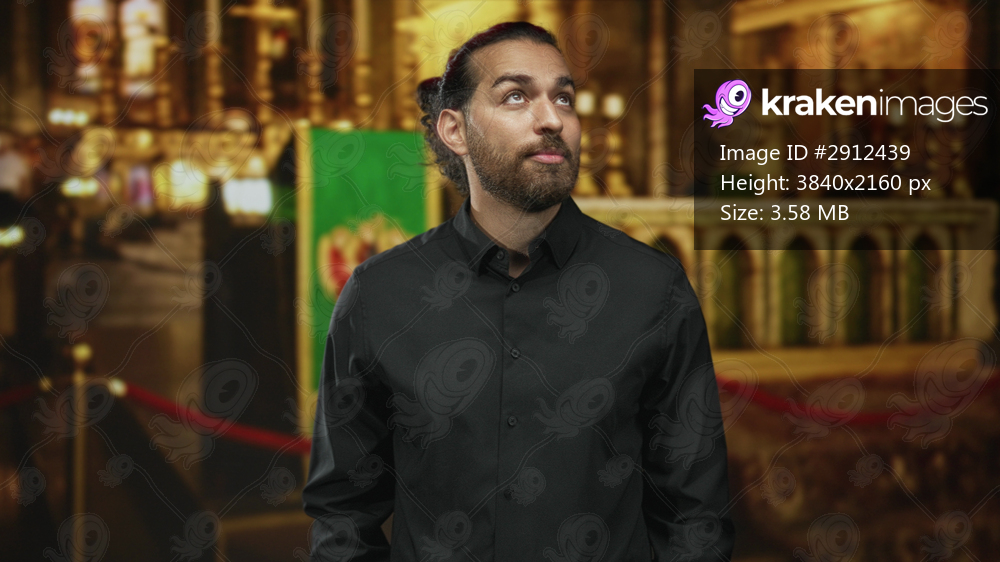 Man with beard and bun looking up inside church building at altar and green banner; quiet reverence.