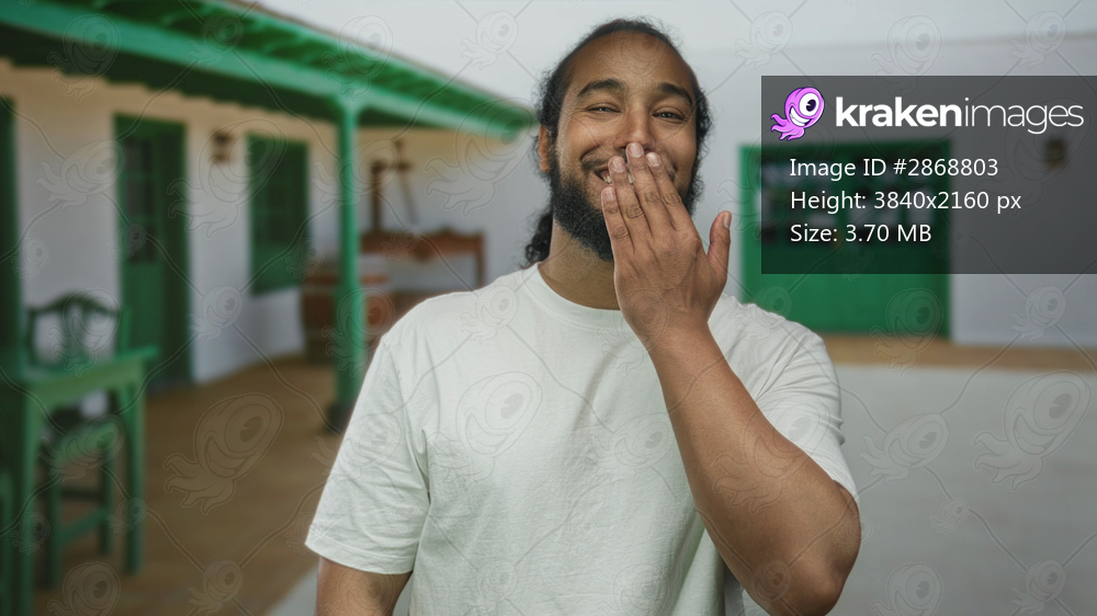 Man with beard covering mouth with hand while smiling and laughing, wearing a white t-shirt in front of a building with green doors and chairs; joy connection. - Kraken Images