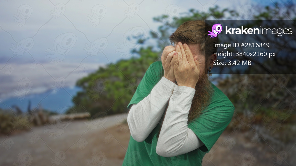 Man with beard covers face with hands on dense forest trail overlooking lake vista; isolation anxiety.
