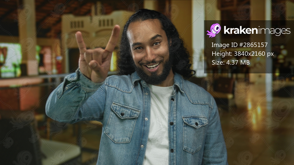 Man with beard and curly hair making rock horns with right hand in hotel building lobby wearing denim jacket and white t shirt, smiling broadly; joyful moment. - Kraken Images