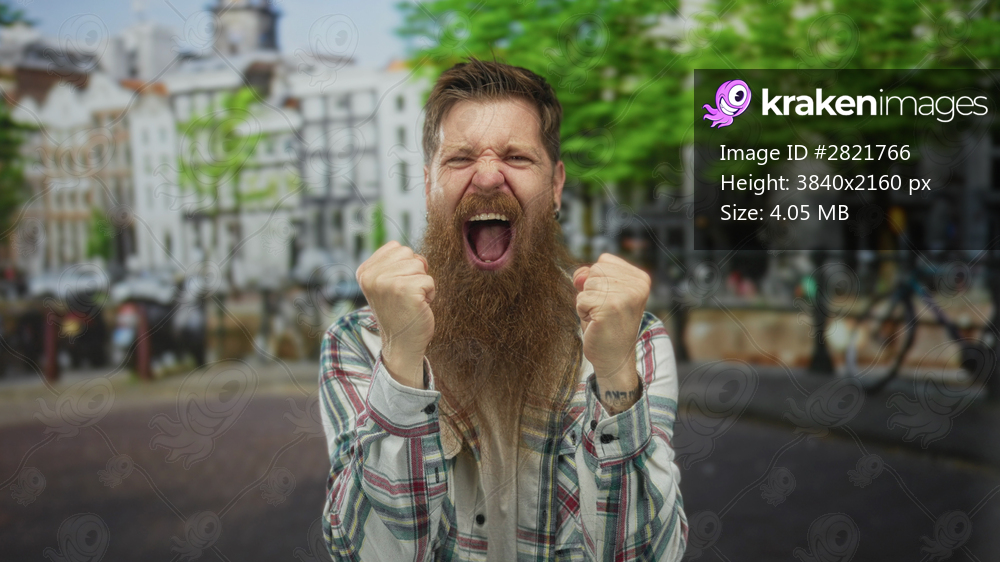 Man with beard and earring clasping hands on chest with open mouth on street in city buildings; astonishment.