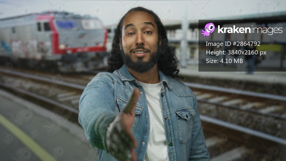 Man with beard extends right hand for handshake on railway platform at station building near tracks, wearing denim jacket and white t shirt; friendly greeting. - Kraken Images