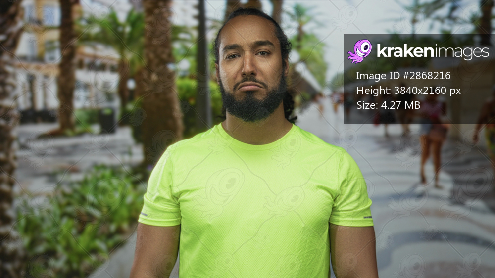 Man with beard and eyes closed, subtle frown, wearing neon green t shirt while standing on a busy city street promenade; contemplation.