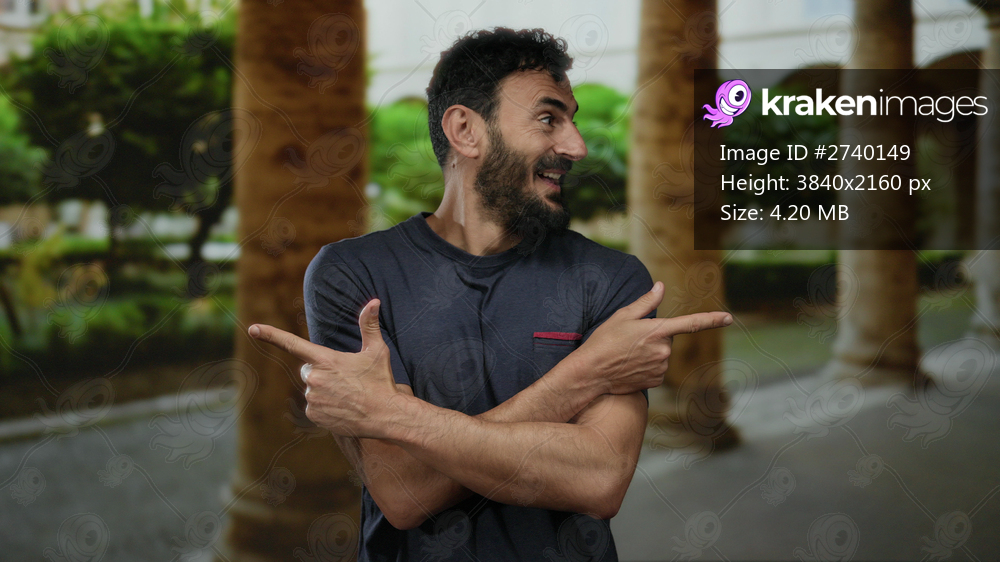 Man with beard gesturing happily in old town rome with blurred columns and greenery in the background, smiling and pointing, captured outdoors in europe. - Kraken Images