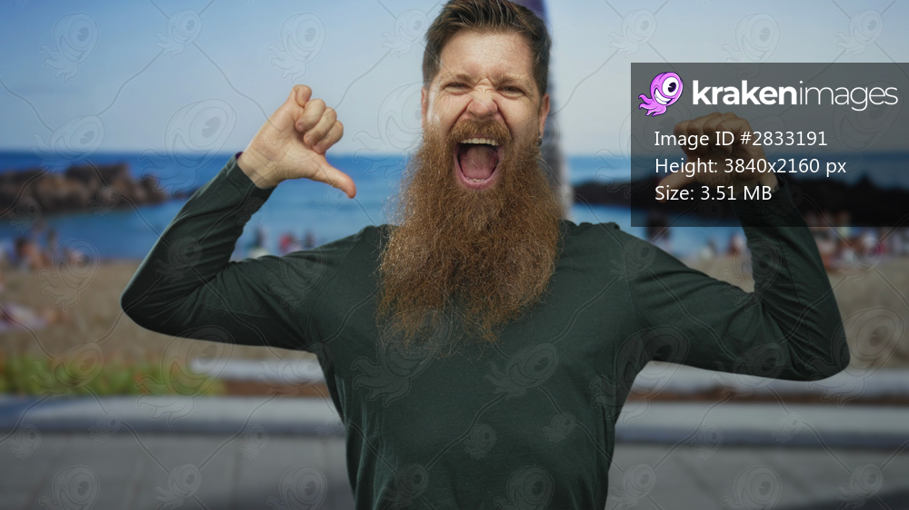 Man with beard giving thumbs down with open mouth under bright sunlight at beach overlooking sea; rejection.