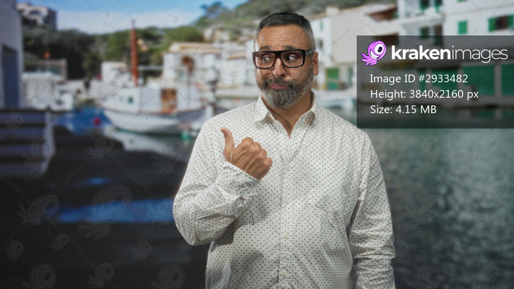 Man with beard giving thumbs up gesture on street by boats at port, wearing glasses and a patterned shirt; playful approval.