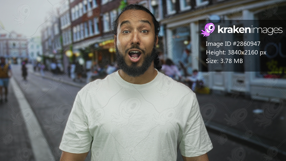 Man with beard glances to the side on a busy street wearing white tshirt and ponytail; urban curiosity.
