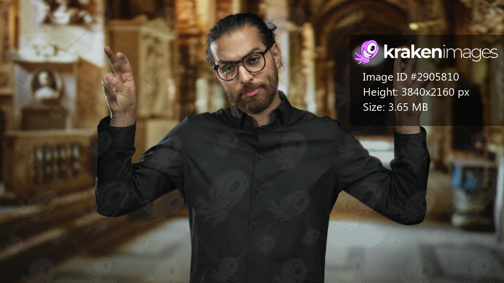 Man with beard and glasses, hands raised in prayerlike gesture wearing black shirt inside a building aisle with ornate columns; calm reflection.
