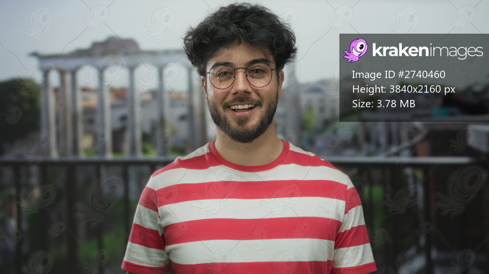 Man with beard and glasses in red striped shirt smiling outdoors at roman ruins on a sunny day.