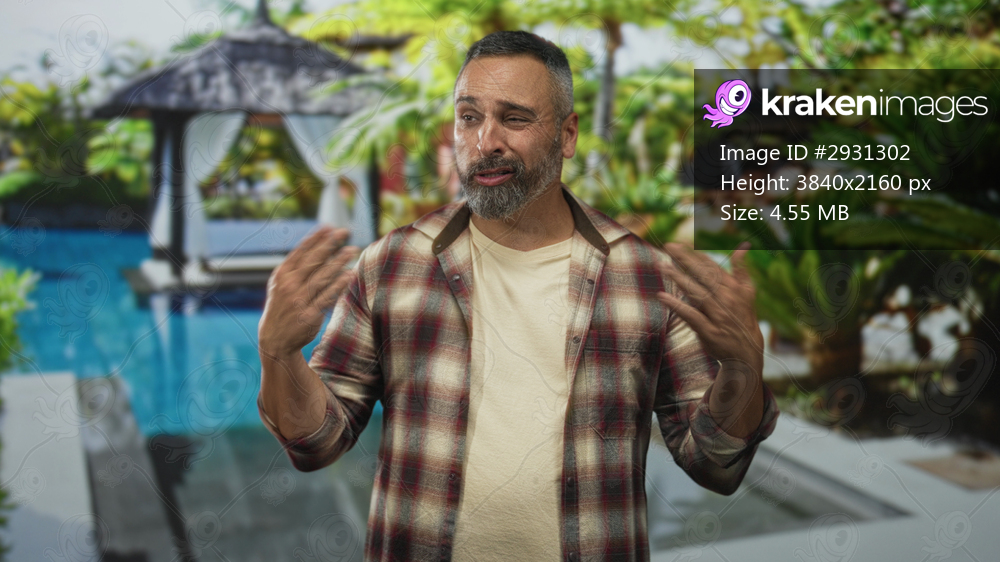 Man with beard and grey hair hands to chest gesture at outdoor pool pavilion; annoyance self reflection.