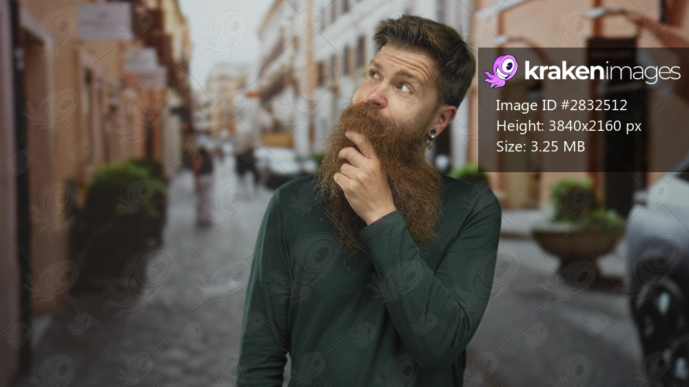 Man with beard and hand on chin looking upward on vibrant street with blurred passersby; reflection insight curiosity imagination.