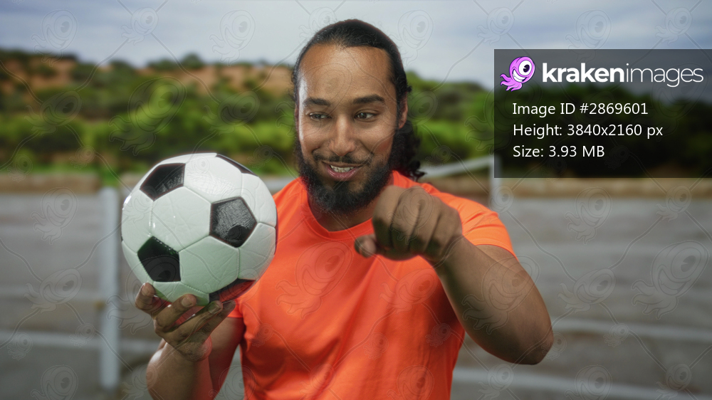 Man with beard holding a soccer ball and waving open hand while smiling on street with goalpost nearby; joy teamwork camaraderie.