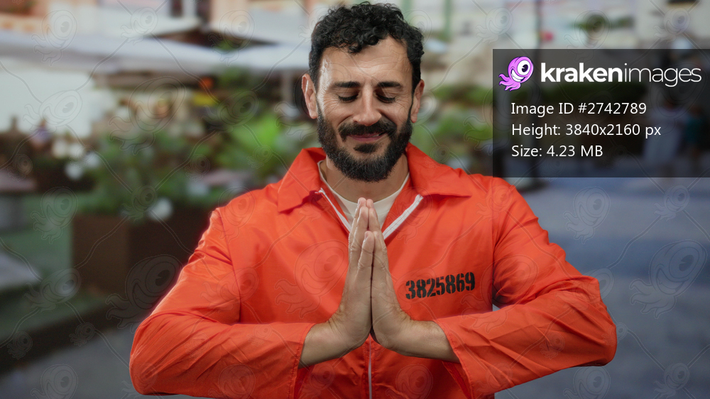 Man with beard in orange jumpsuit smiling and praying outdoors on a street scene.