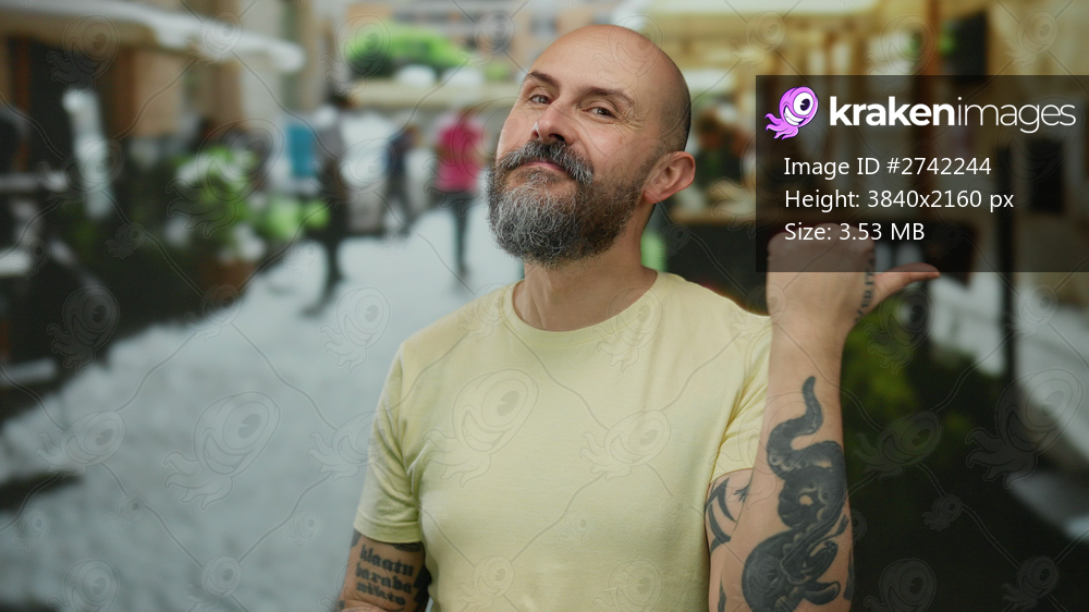 Man with beard in urban street pointing with tattoos wearing casual clothes looks confident and focused in an outdoor city environment.