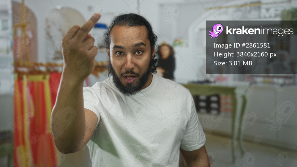 Man with beard in white tshirt shows middle finger toward camera inside building retail shop interior closeup confrontational expression; defiance provocation. - Kraken Images