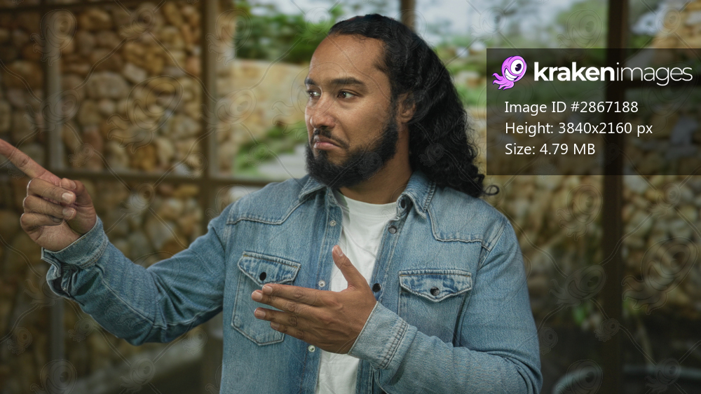 Man with beard and long curly hair points finger near window in studio with stone wall backdrop wearing denim jacket and white tshirt; skepticism deliberation. - Kraken Images