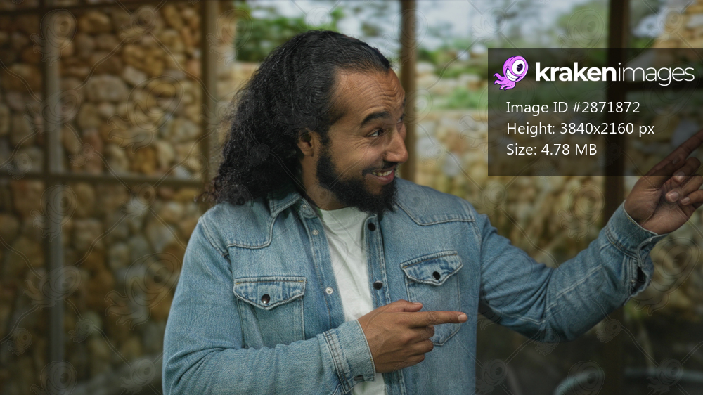 Man with beard and long curly hair points finger near window in studio with stone wall backdrop wearing denim jacket and white tshirt; skepticism deliberation. - Kraken Images