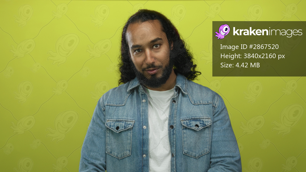 Man with beard looking at camera wearing denim jacket and white tee in lime green studio; confident presence.