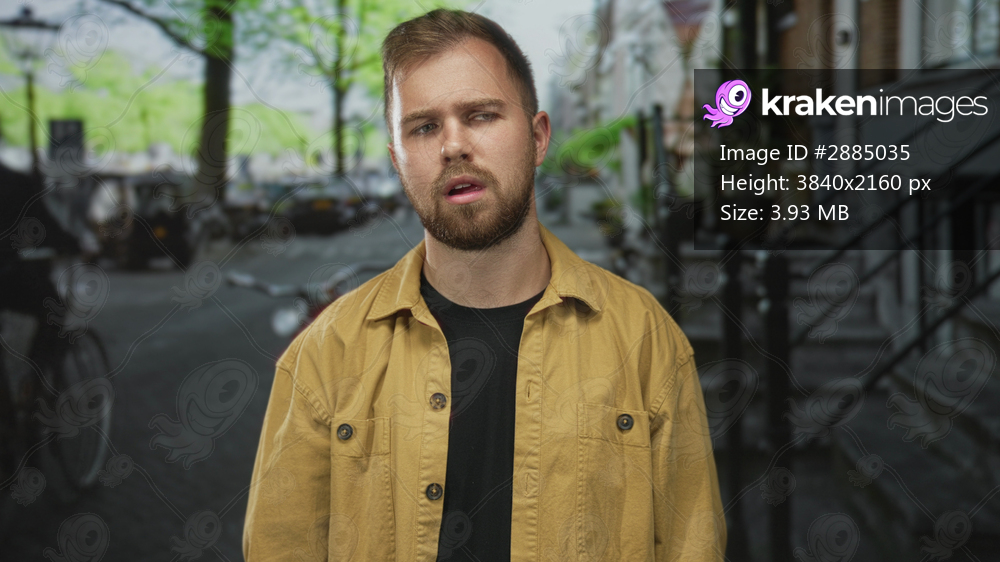 Man with beard looking upward on street wearing yellow jacket, standing beside bicycle and stone steps by building and tree near bollard; thoughtful curiosity. - Kraken Images