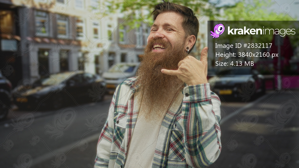 Man with beard makes call gesture with hand in front of cars on street; call communication friendliness.