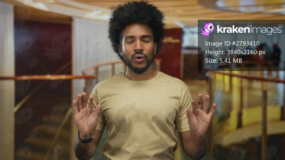 Man with beard meditating indoors in modern hotel hallway, reflecting calm and focus amid serene atmosphere.