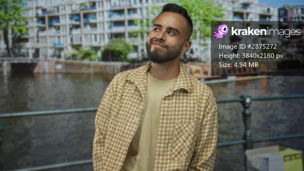 Man with beard and neck tattoo smiling and looking up beside a passing canal tour boat and iron railing on street near amsterdam apartments waterfront; serenity. - Kraken Images