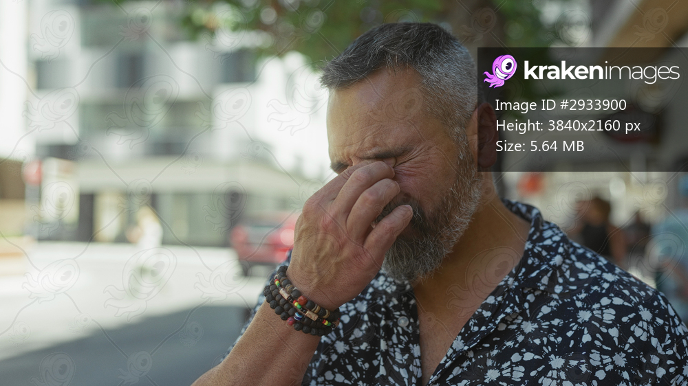 Man with beard pinches nose and raises hand to face on street near shops and parked cars; urban discomfort.